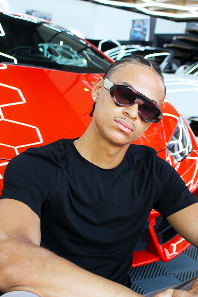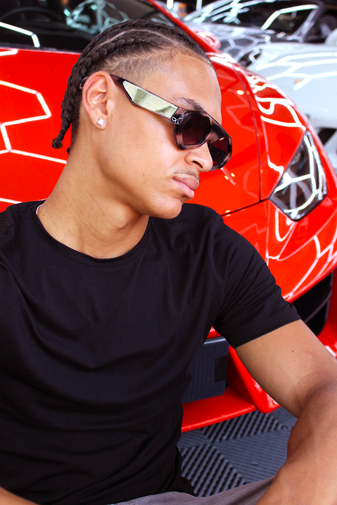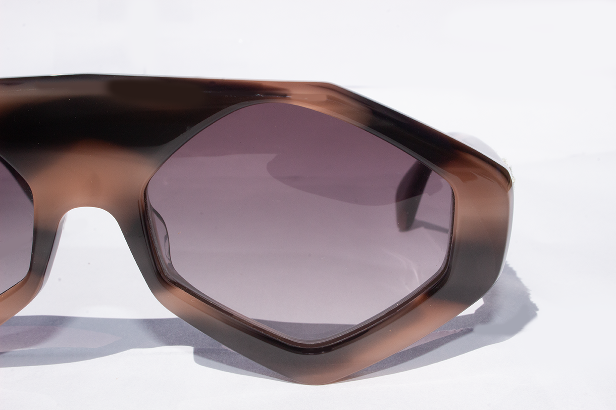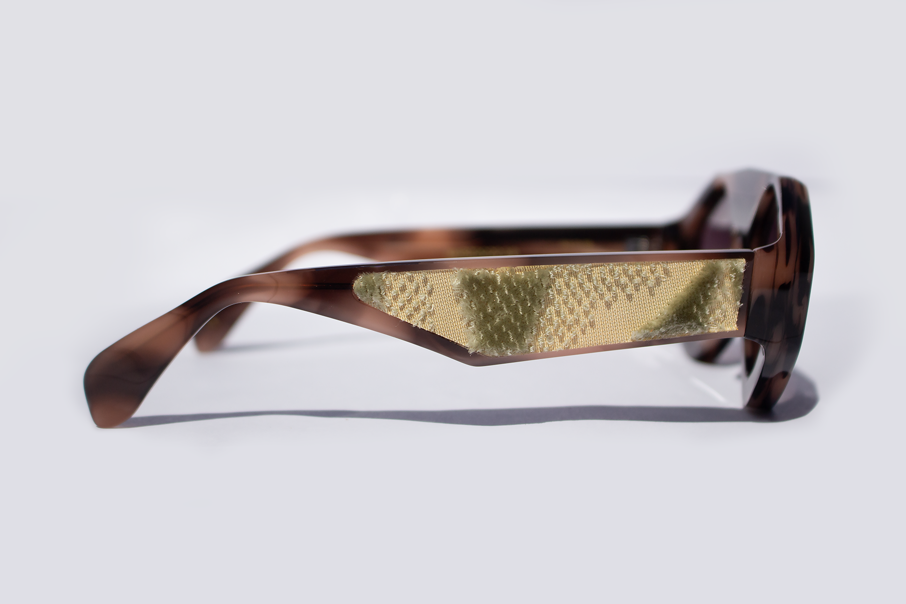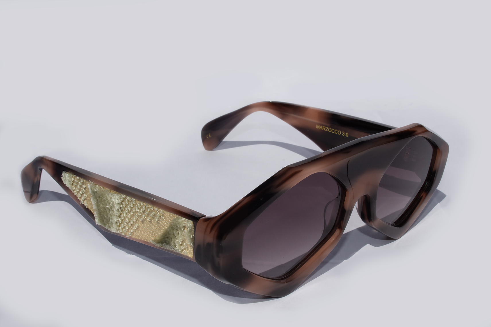 Geometric and captivating orange sunglass. On the side rods is set the jade-green green silk velvet, a sixteenth-century Italian "Stella" Design hand-woven in Florence