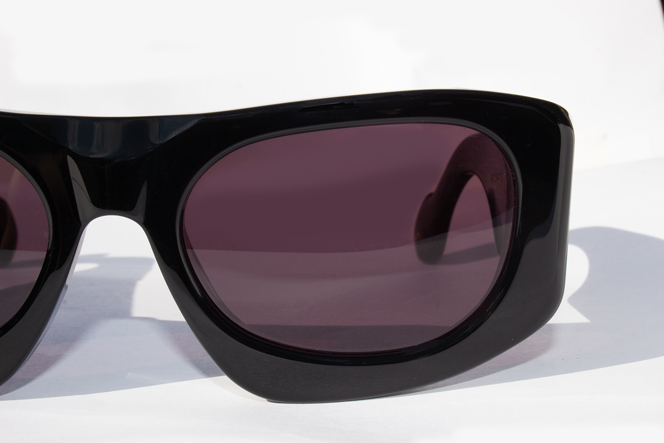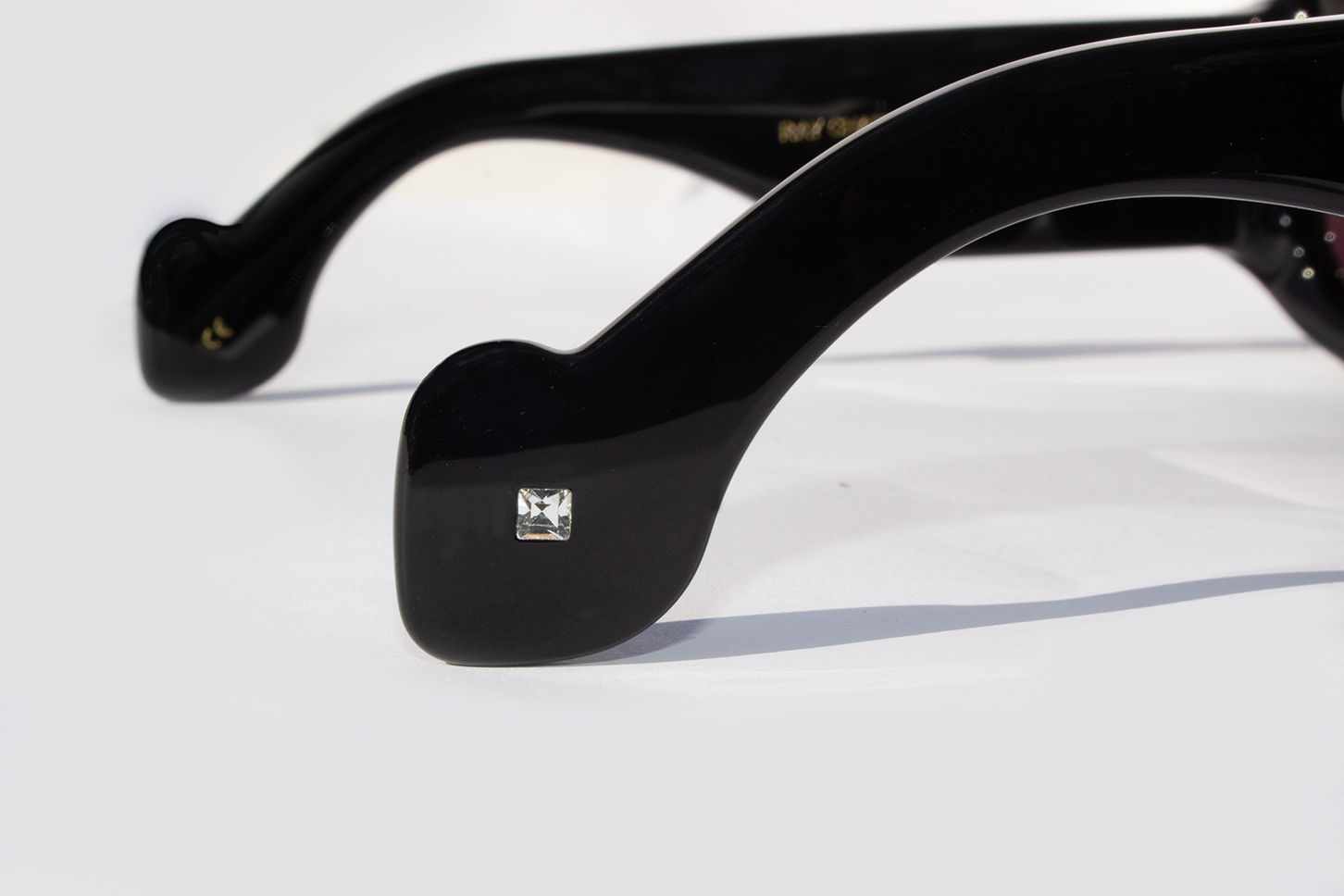 A compact Ray Charles inspired wrap-around with oversized temples, custom set in the side rods the black and silver silk velvet "Palio", Italian Design of the sixteenth-century, handwoven in Florence