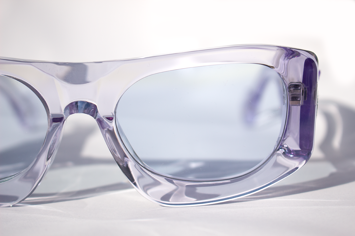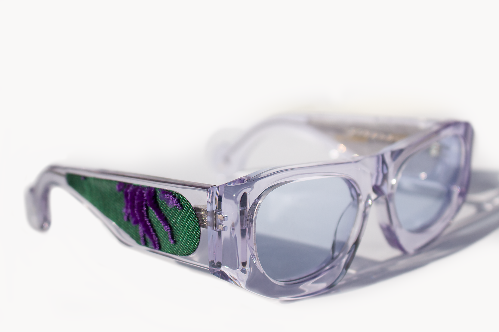 A compact Ray Charles inspired wrap-around with oversized temples, custom set in the side rods the viole silk velvet "Mercurio", Italian Design of the sixteenth-century, handwoven in Florence