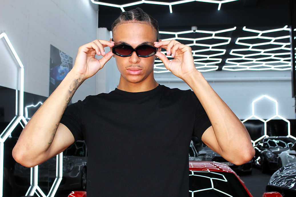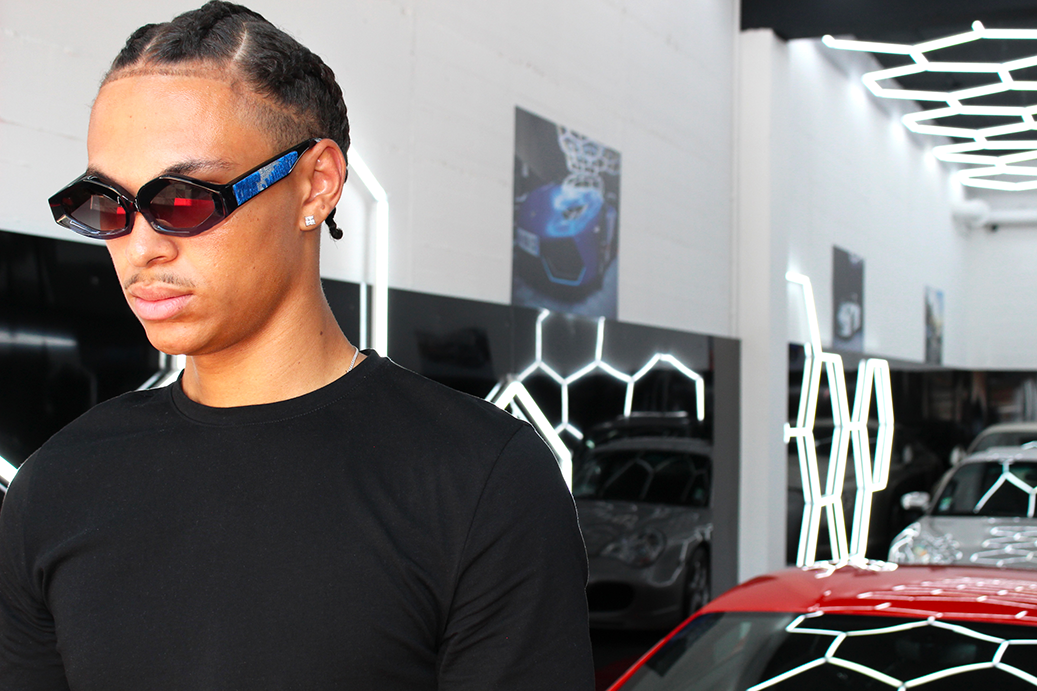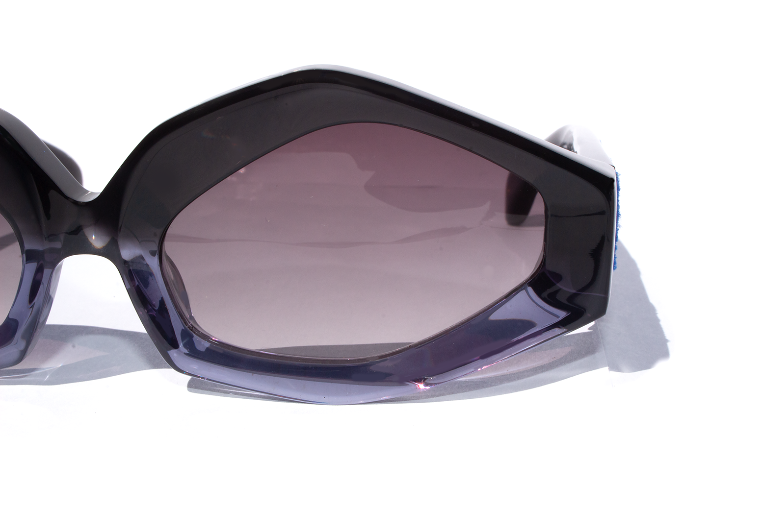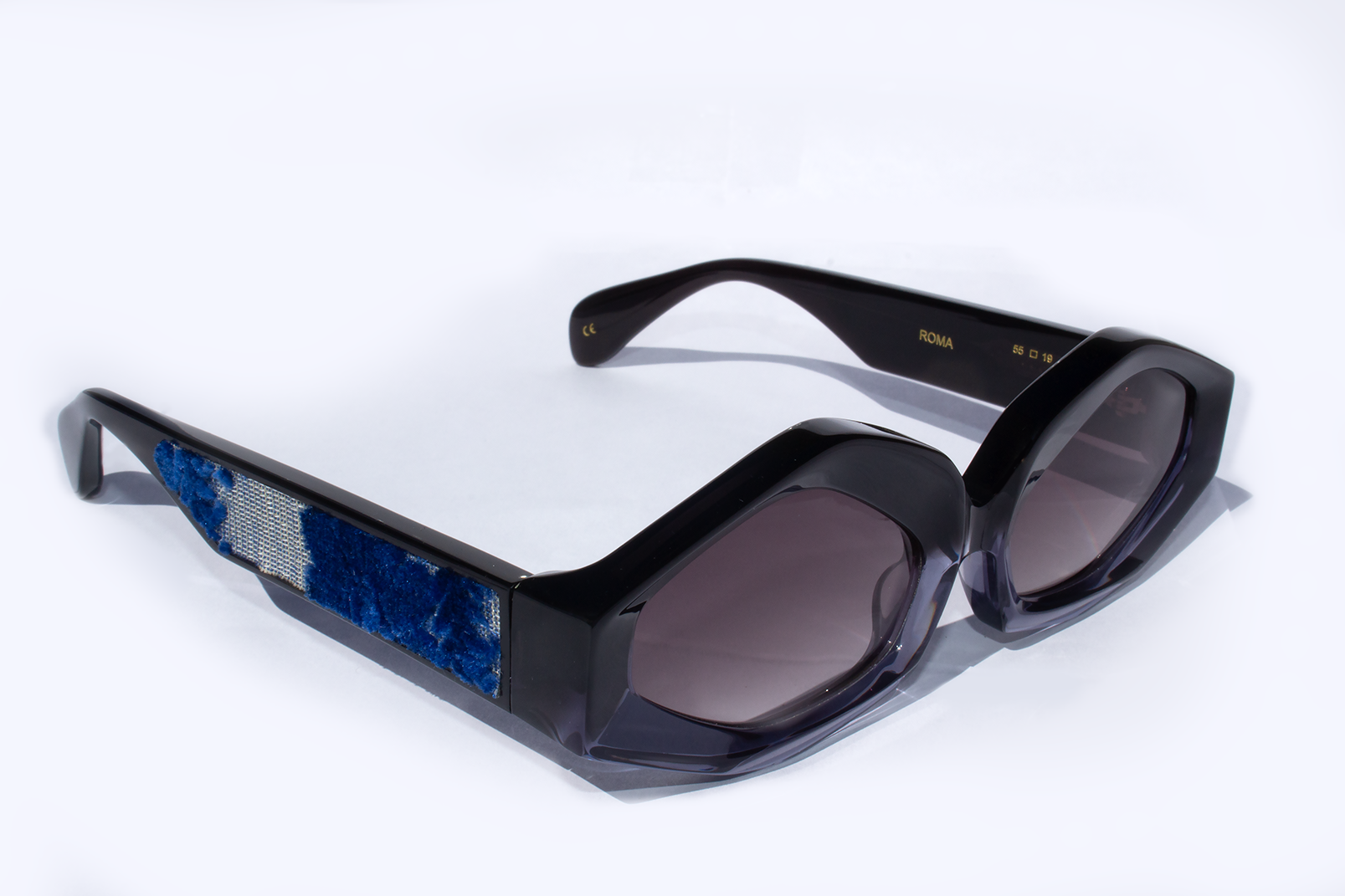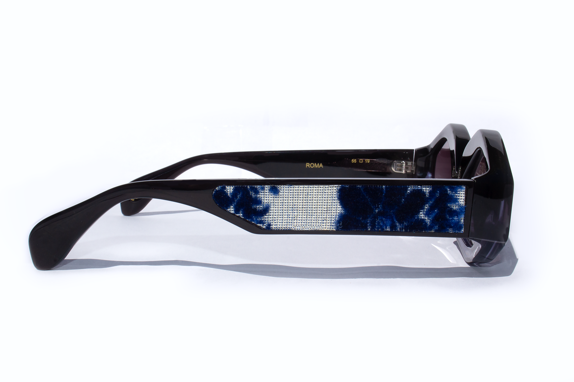 Bold and futuristic frames with angular cat-eye shape sunglass. On the side rods is set the blue and silver silk velvet, a sixteenth-century Italian "Dogaressa" Design hand-woven in Florence