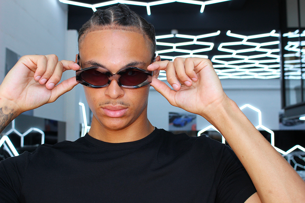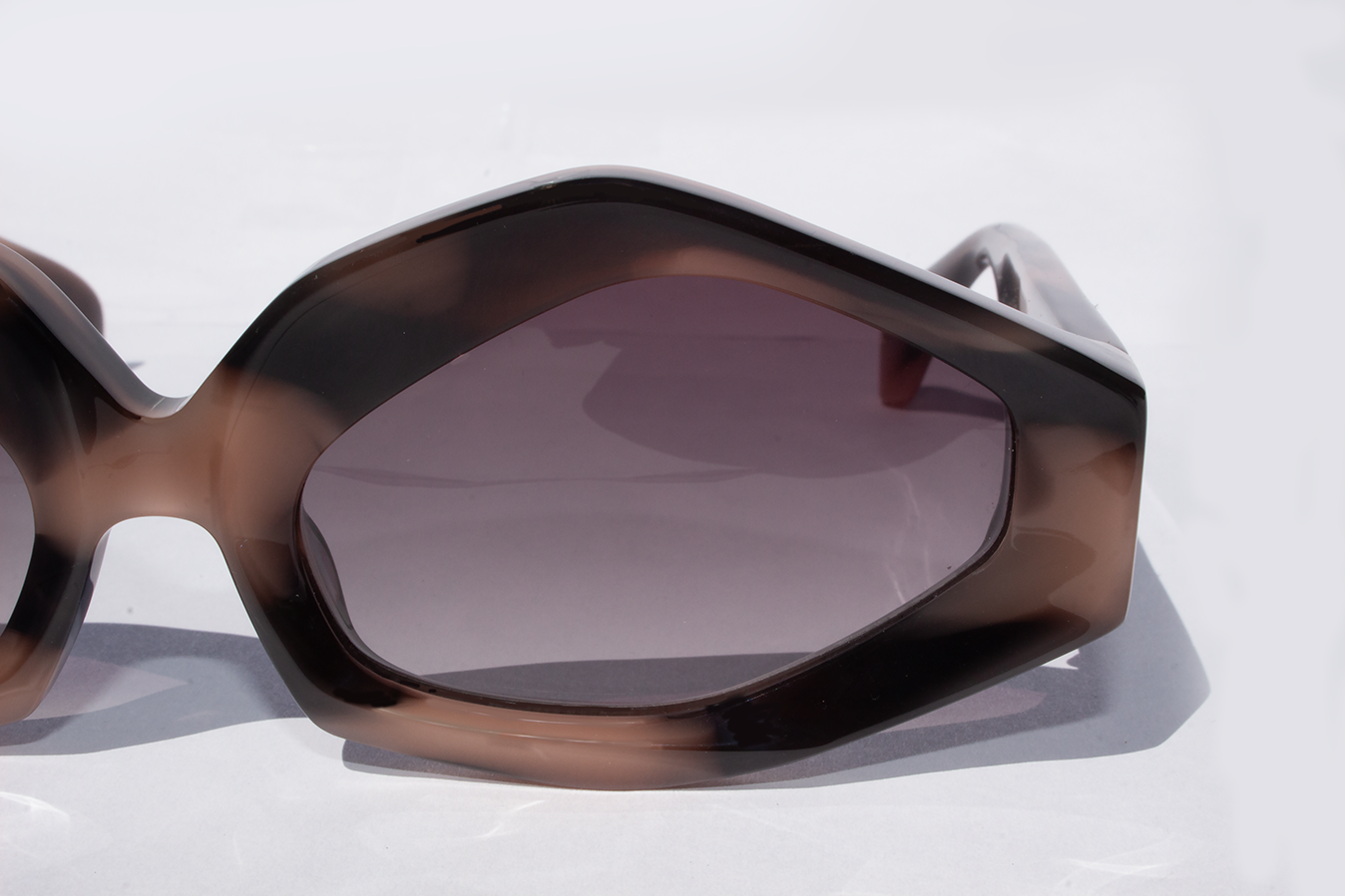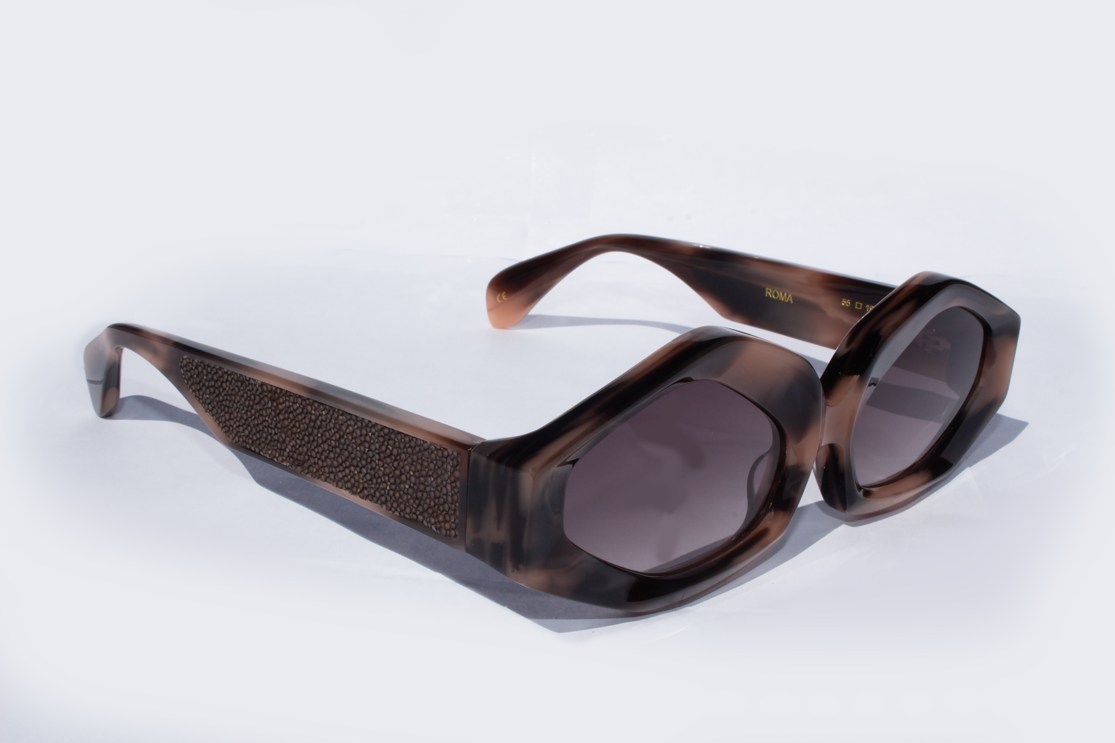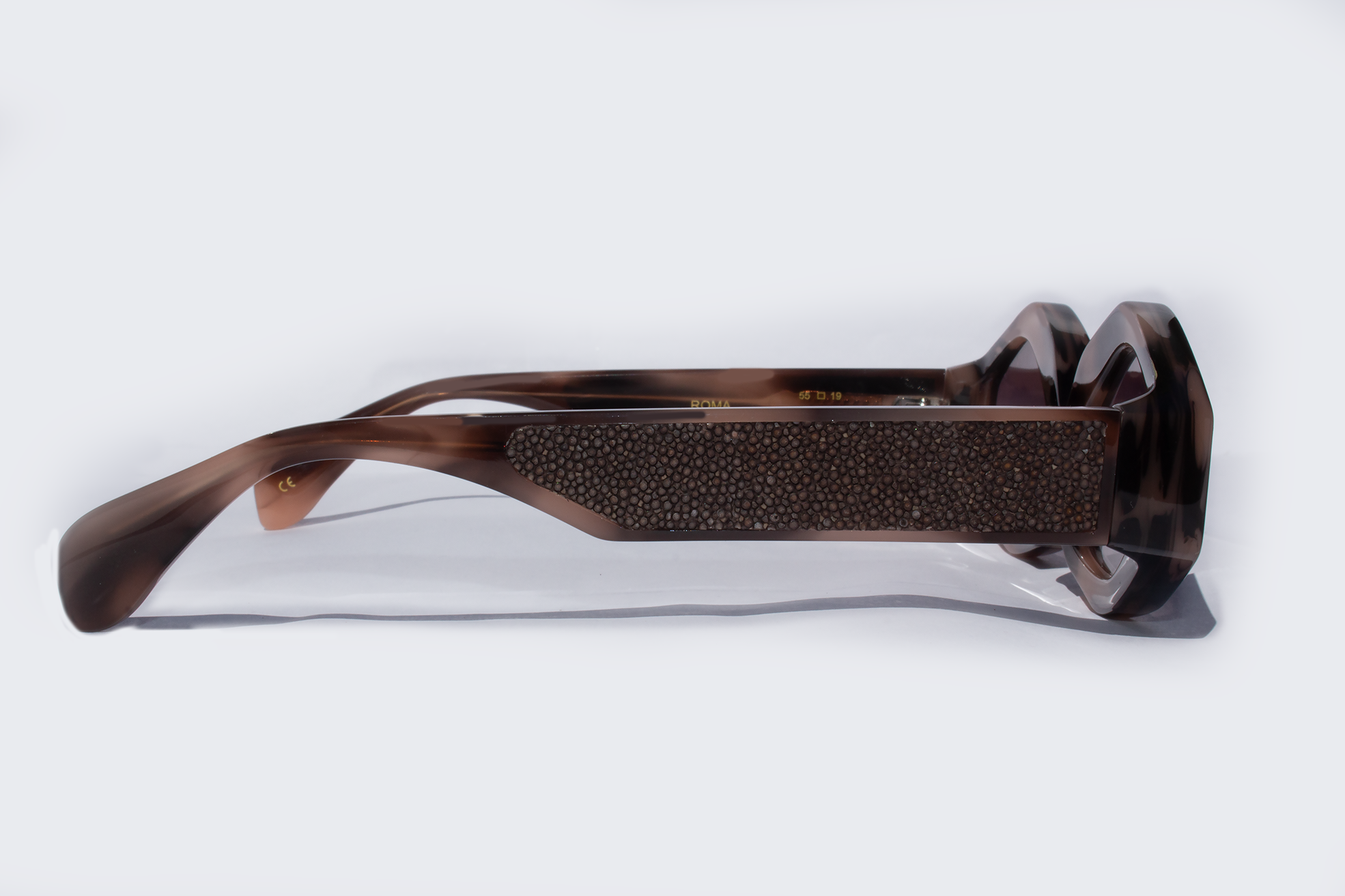 Bold and futuristic frames with angular cat-eye shape sunglass. This sunglass is havana colored on the side rods is set the black galuchat handcrafted.