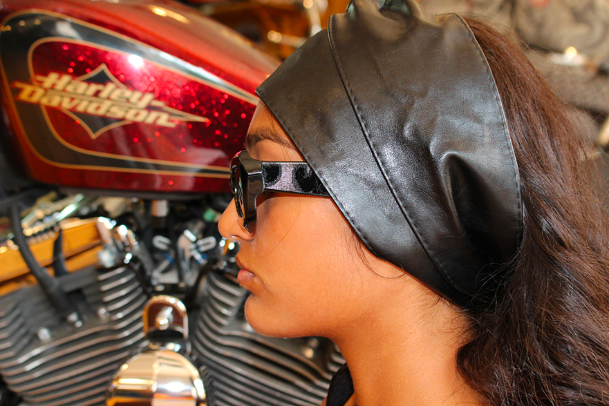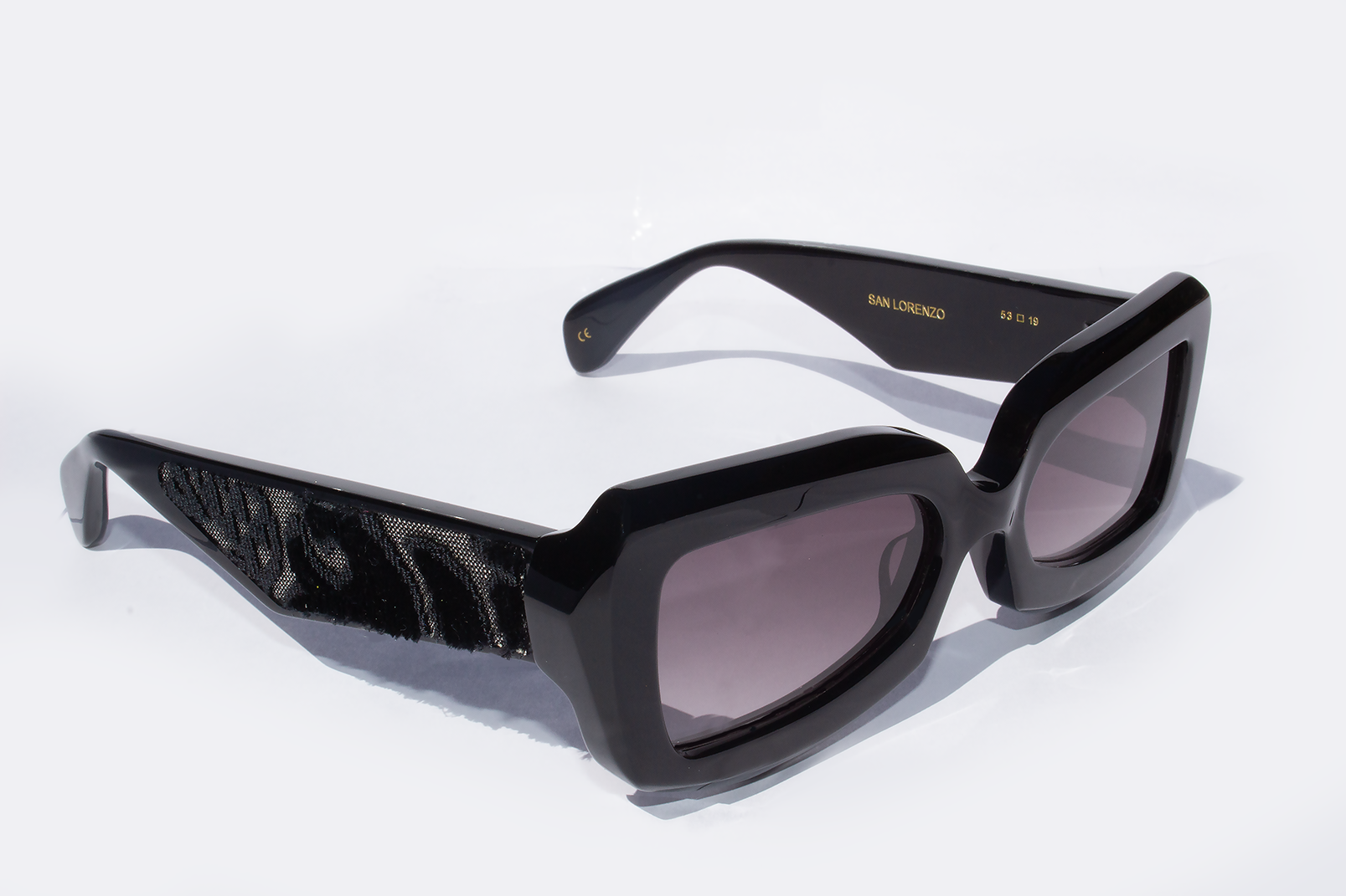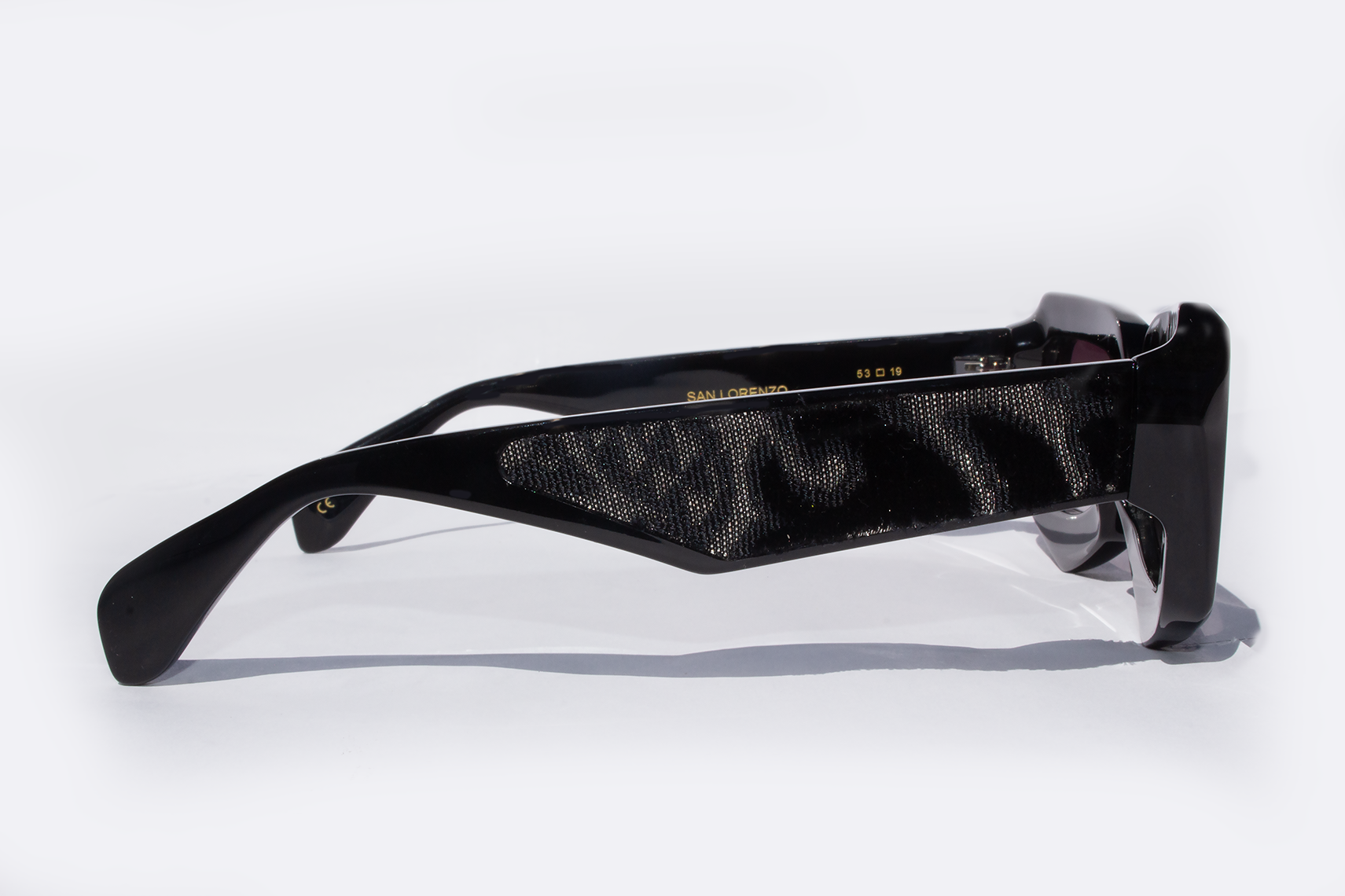 Oversized, square-shaped spectacles with angular cat-eye shape sunglass. On the side rods is set the black and silver silk velvet, a sixteenth-century Italian "Palio II" Design hand-woven in Florence
