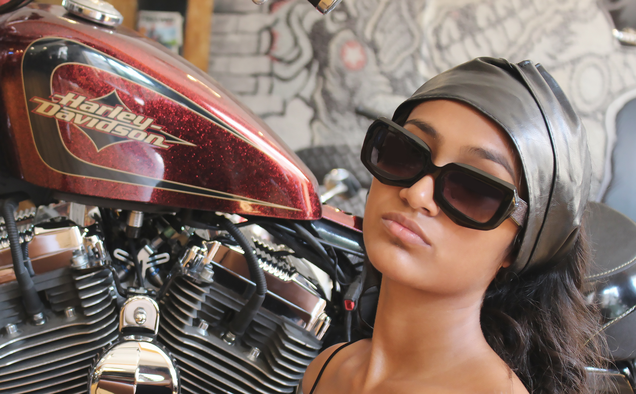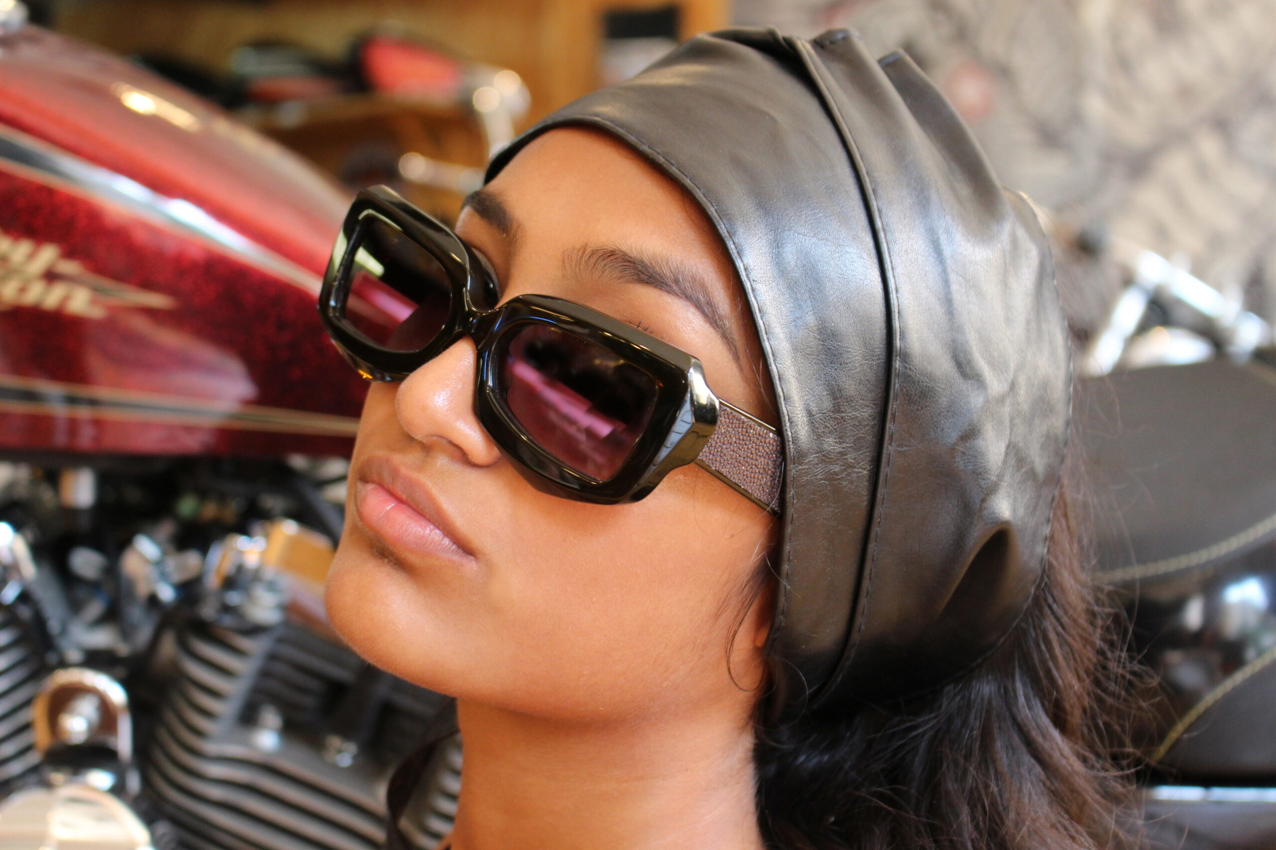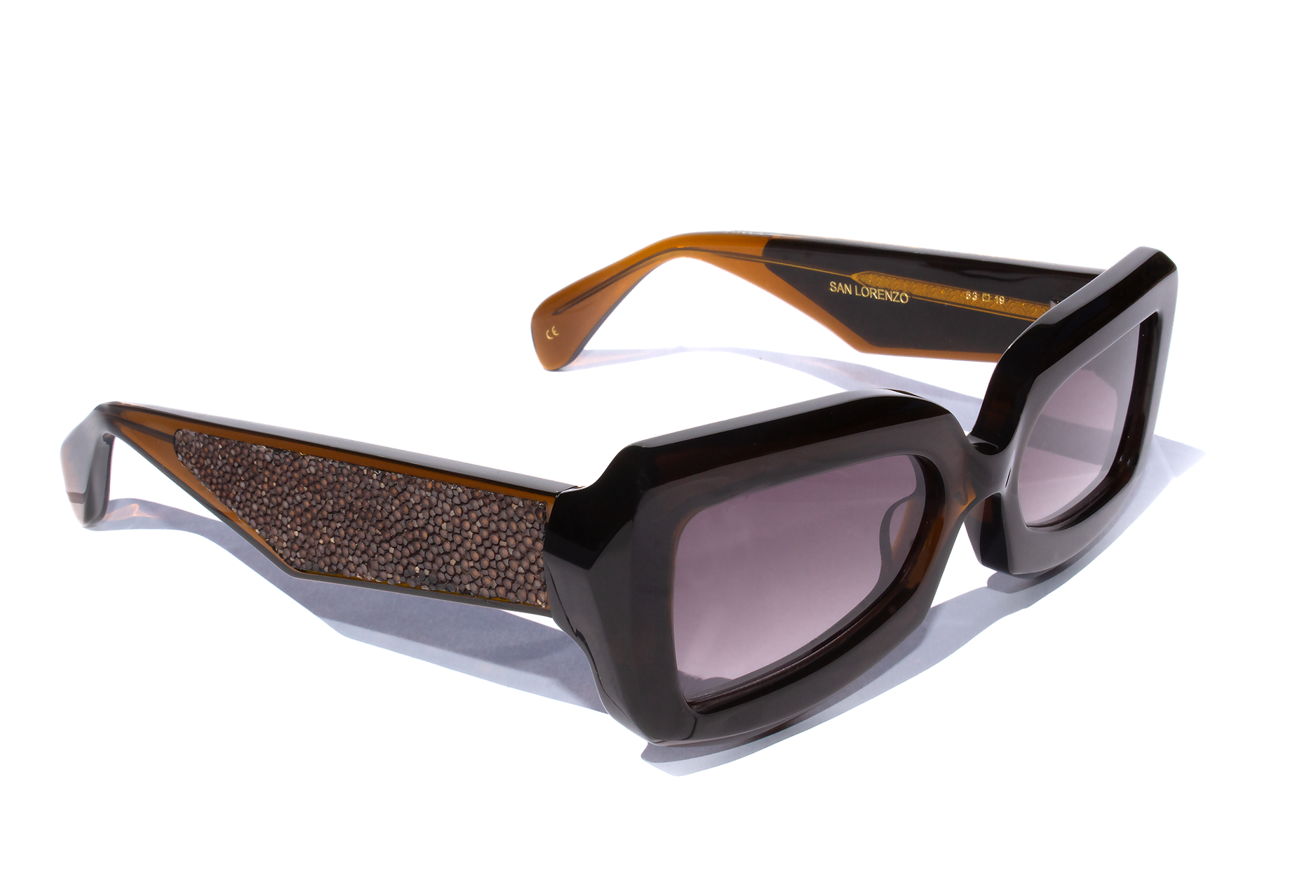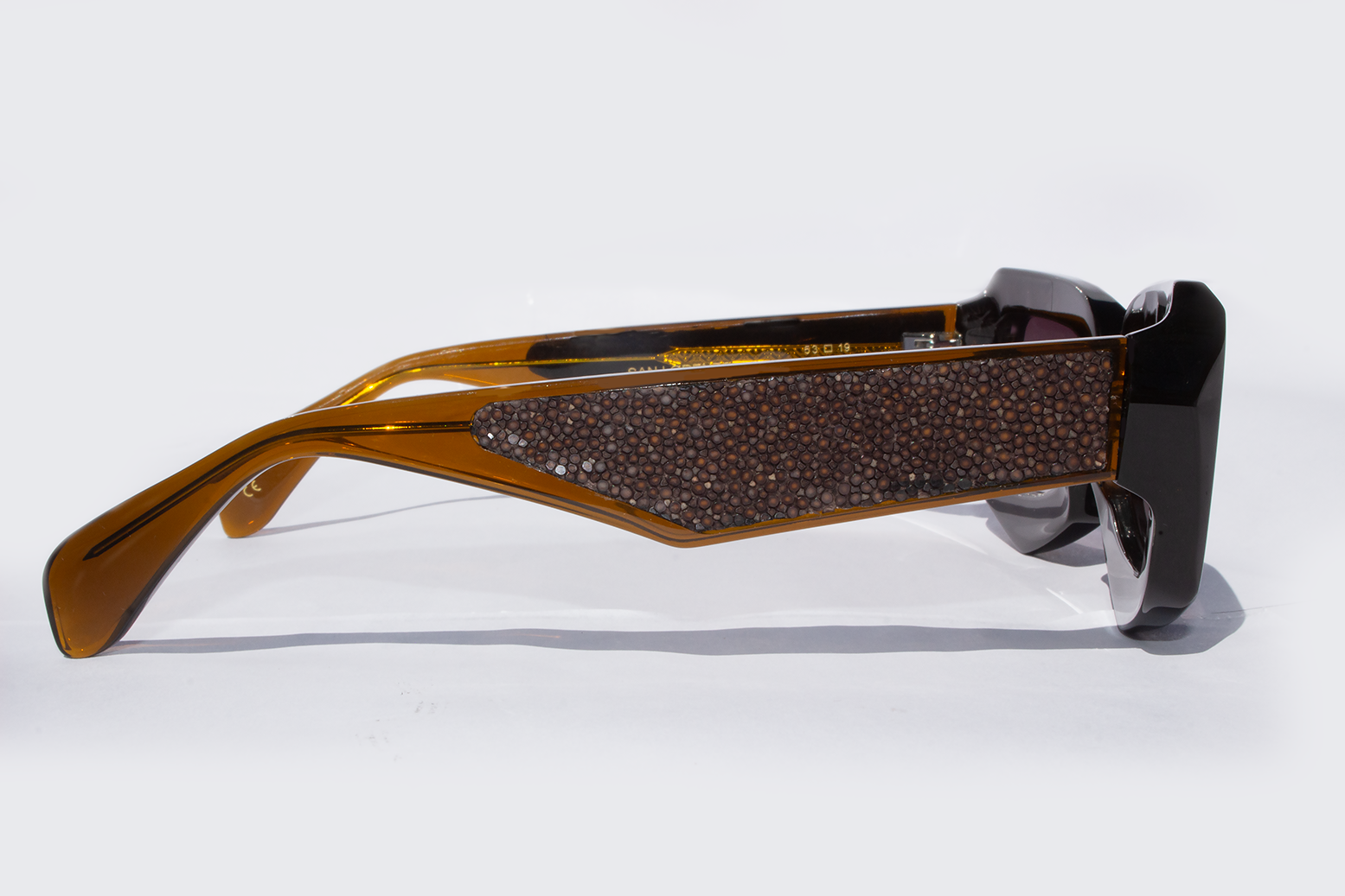 Oversized, square-shaped spectacles with angular cat-eye shape sunglass. This sunglass has a warm honey color and on the side rods is set the black galuchat handcrafted.