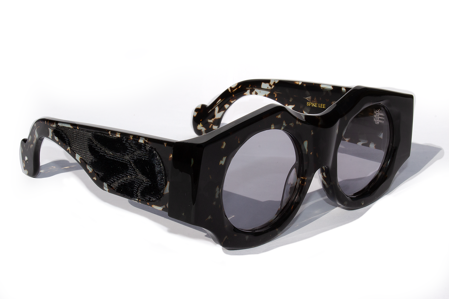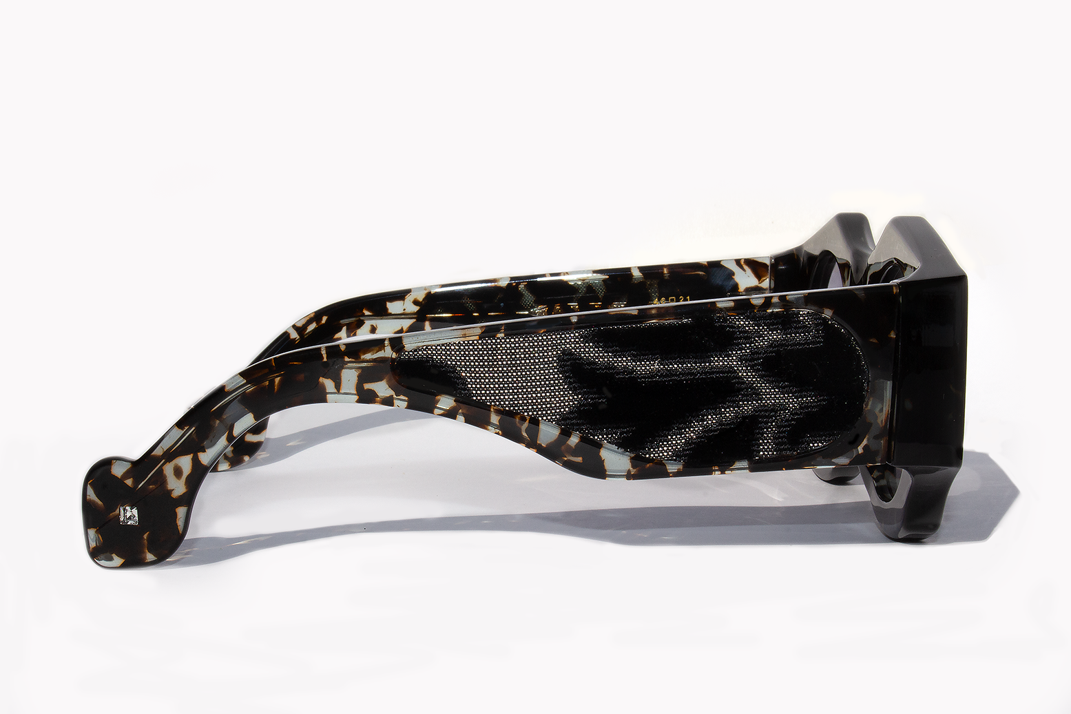 Rounded, architectural lines in polished acetate. Custom set in the side rods the black and silver silk velvet "Palio", Italian Design of the sixteenth-century, handwoven in Florence