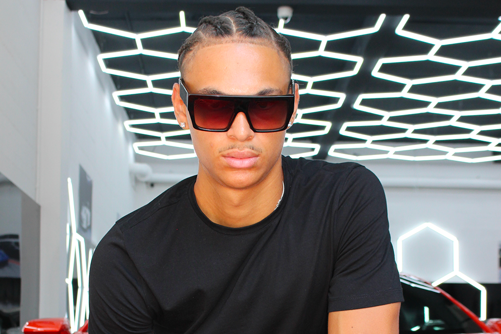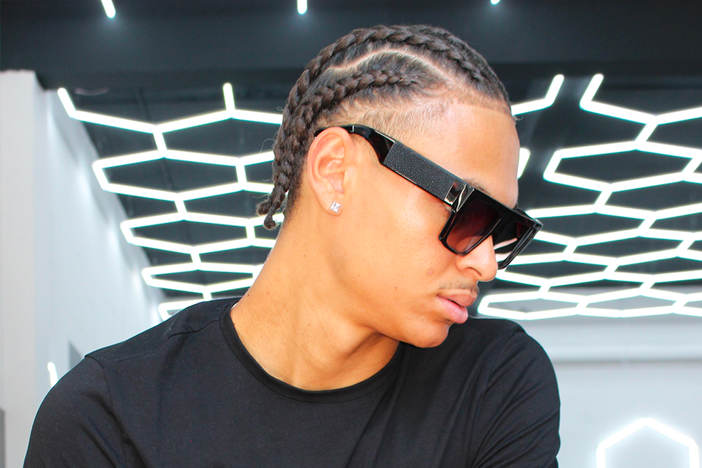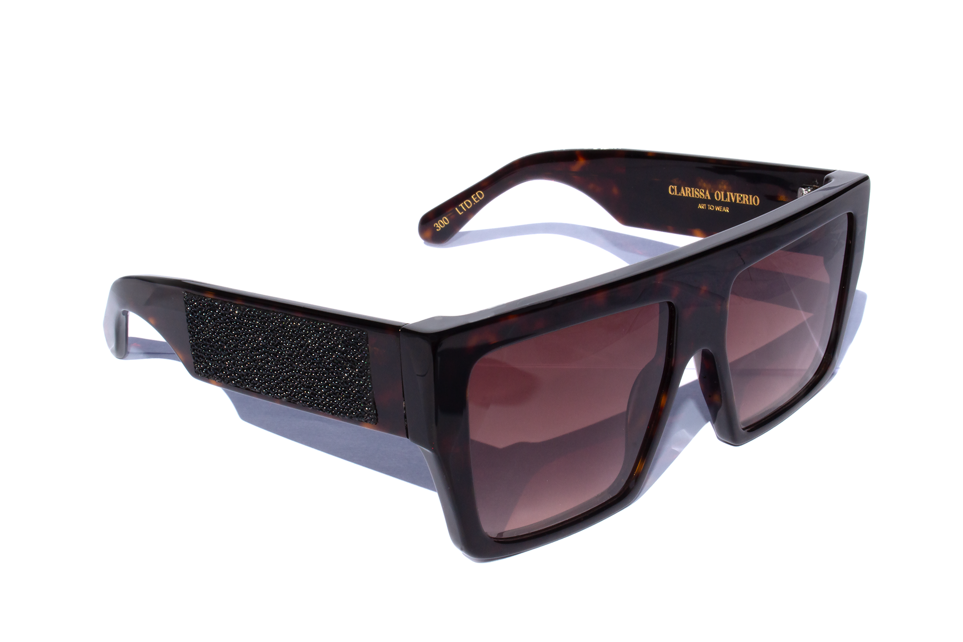 A bold and elegant sunglass, with a straight bar in the front. On the side rods is set a black galuchat handcrafted.