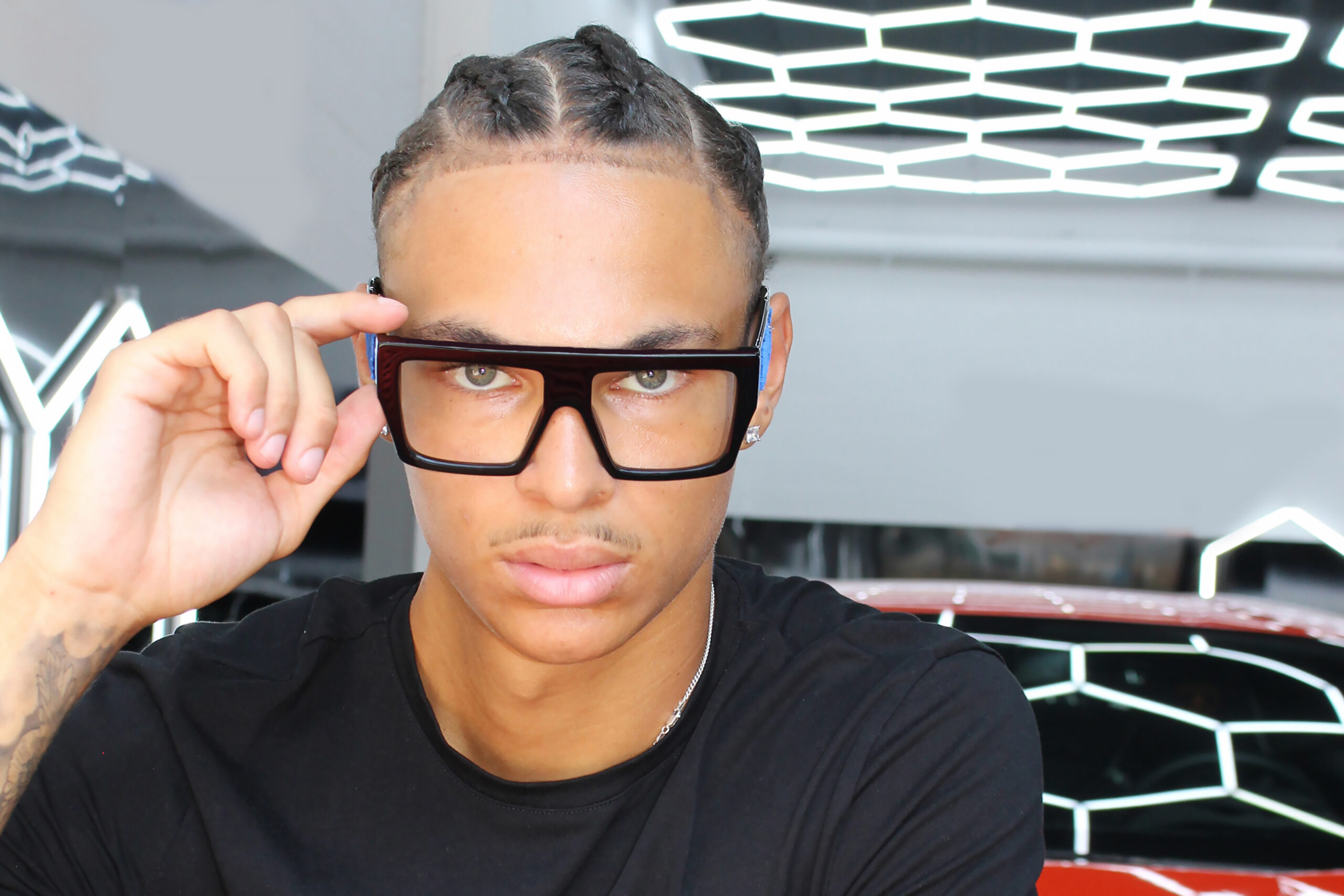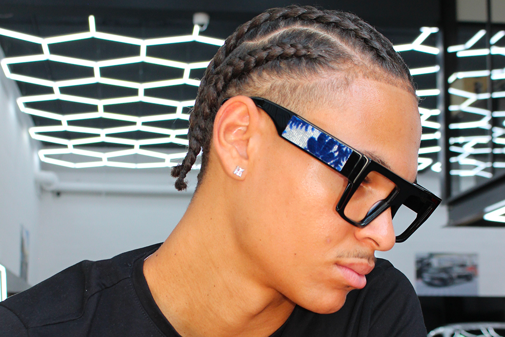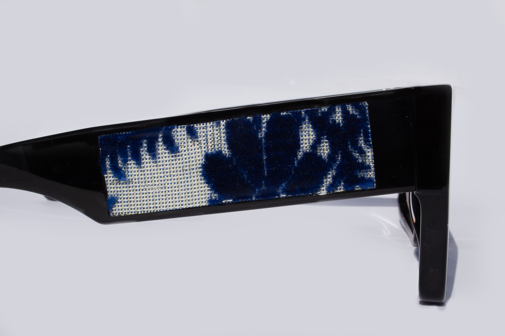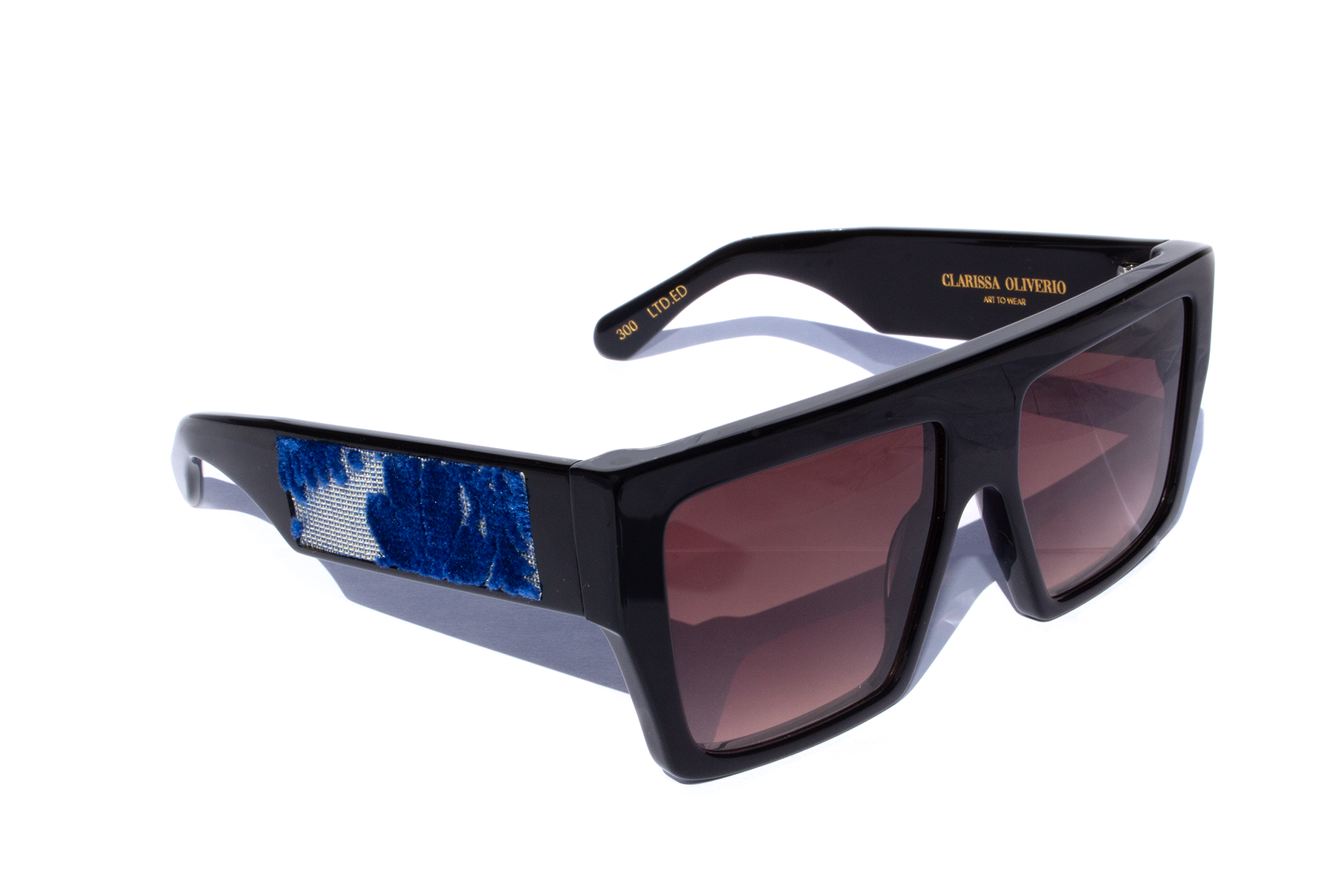 Black acetate sunglass, straight bar in the front, big and comfortable, on the side ads is set a blue and silver silk velvet "Dogaressa" Design of the Italian sixteenth-century handwoven in Florence