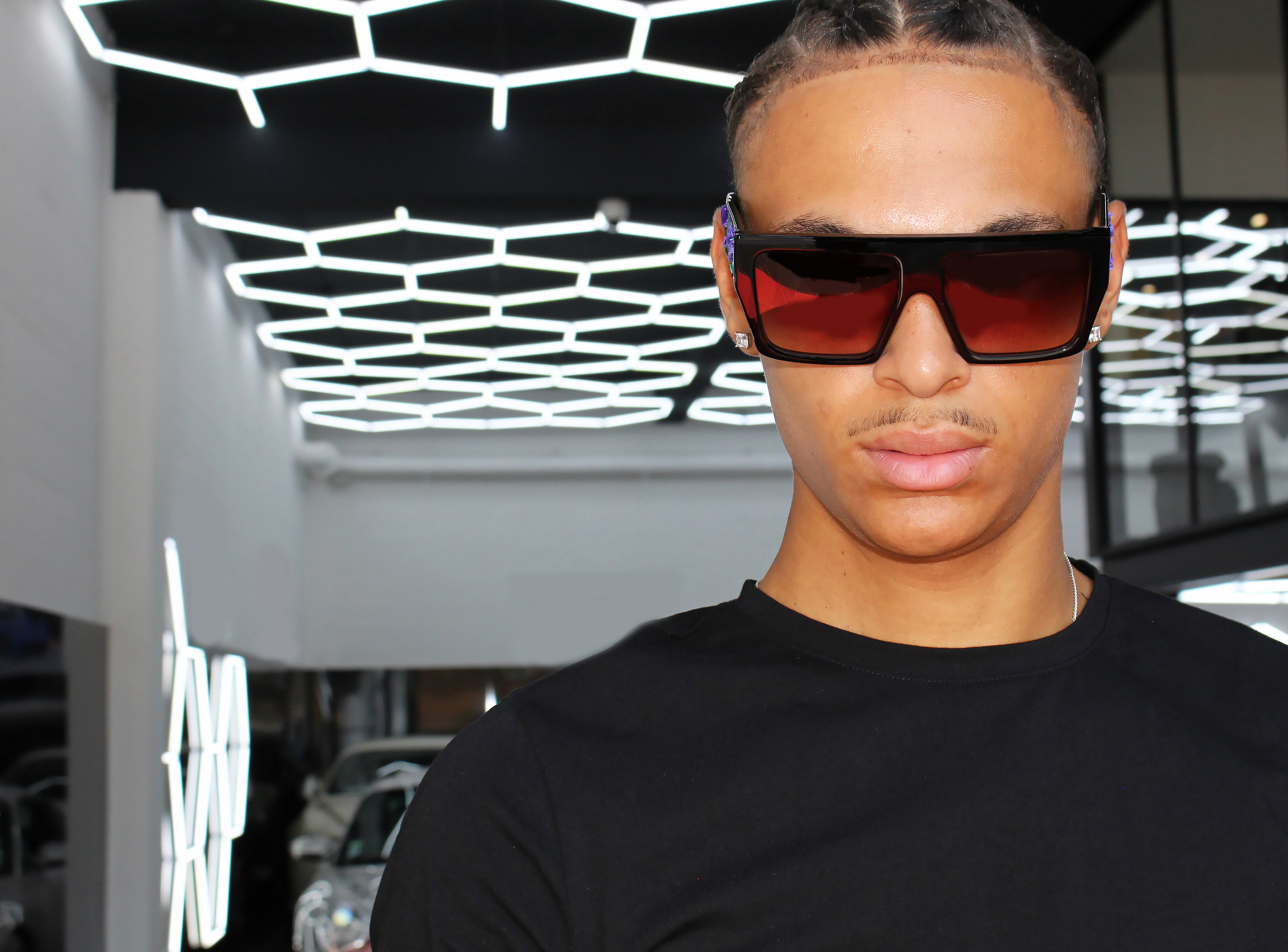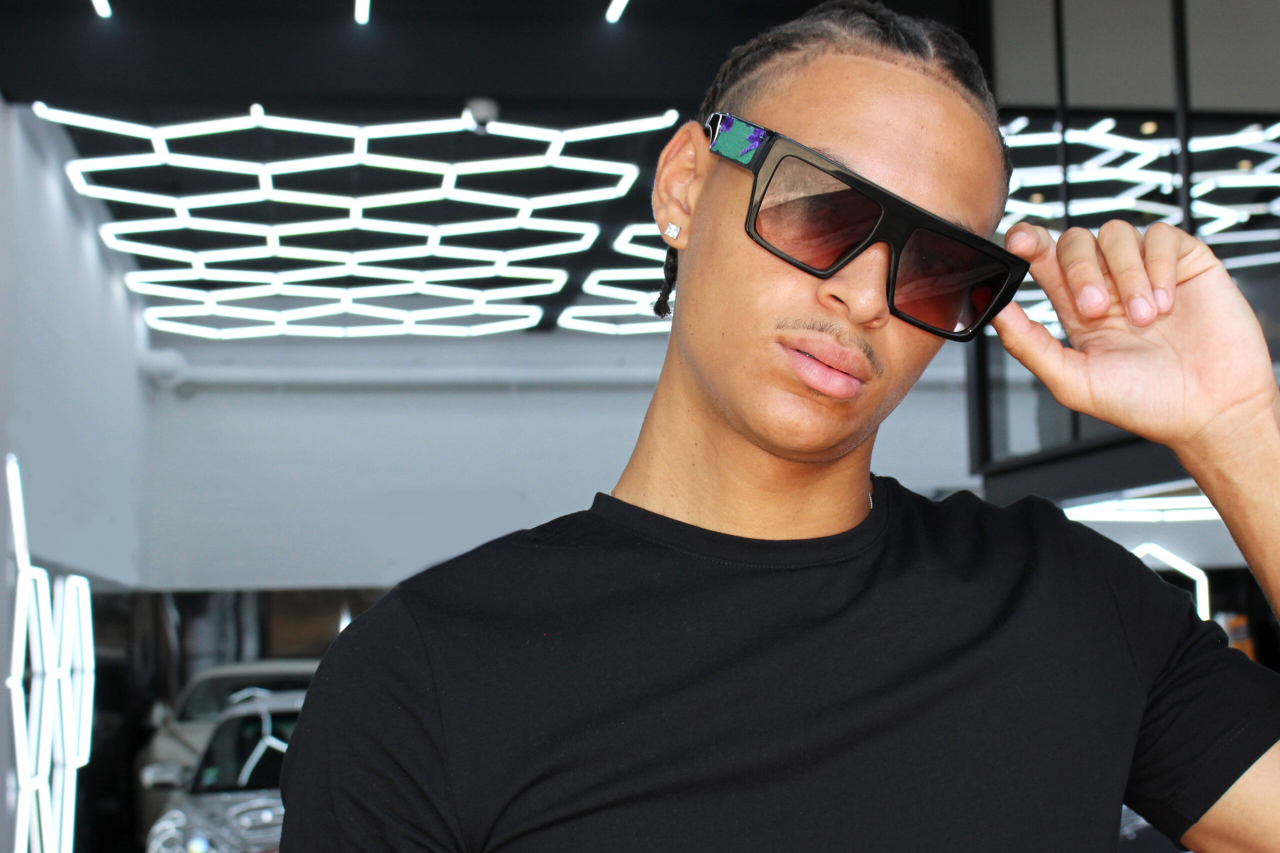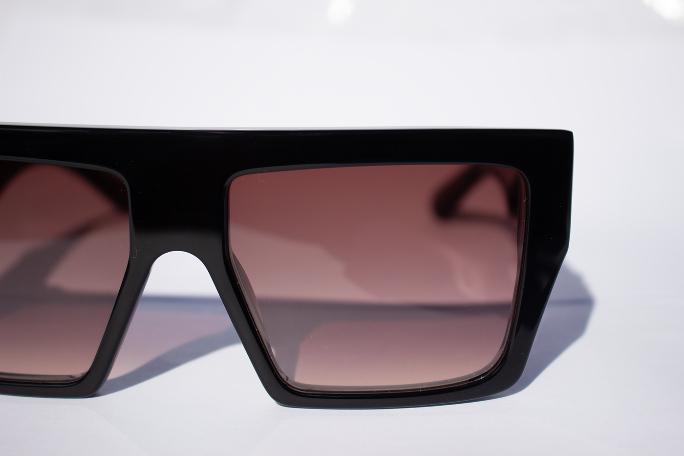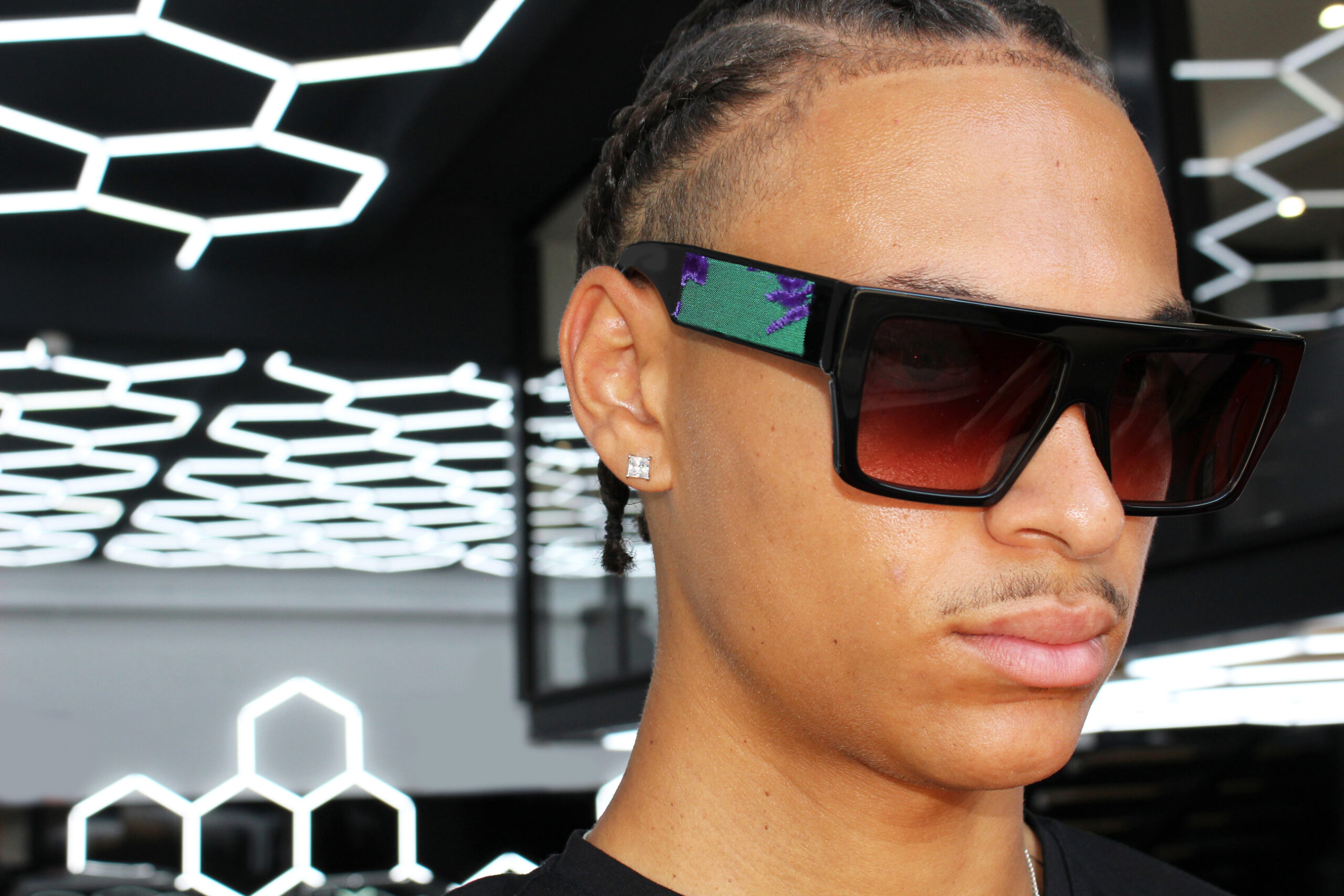 Black acetate sunglass, straight bar in the front, big and comfortable, on the side roads is set a green and violet silk velvet "Mercurio" Design of the Italian sixteenth-century handwoven in Florence