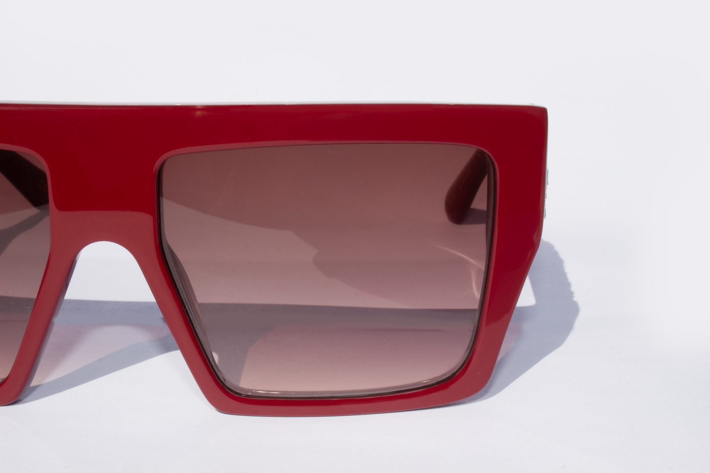 Warm red acetate sunglass, straight bar in the front, big and comfortable, on the temple sides is set a ivory and gold velvet "Palio III" Design of the Italian sixteenth-century, handwoven in Florence